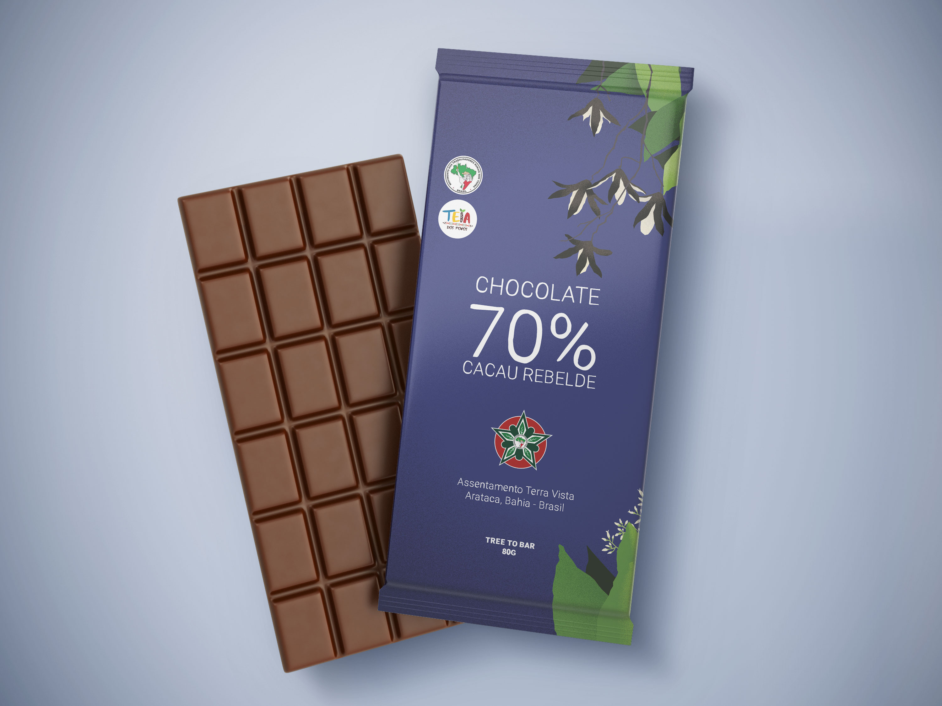 As a volunteer, I faced the challenge of designing new packaging for the chocolate line at Terra Vista, a settlement of the Landless Rural Workers Movement (MST) in Arataca (BA). The community has been on the land since 1994 and is home to 55 families on 904 hectares of land. They are known for their sustainable practices, including environmental conservation, seedling production, and harmonious coexistence with the Atlantic Forest. Terra Vista is also world-renowned for its organic cacao and fine chocolate.